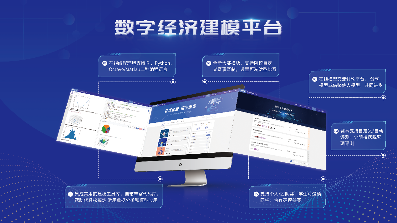 本次新升级上线DEMA数字经济建模分析平台,模块全新升级,带来了数据中心、建模中心、大赛中心,同步新更新了Python编程基础系列课程-《从Python入门到数据分析》课程,从零基础开始帮助学生从分析 Python 语言及常用的数据分析及数据可视化的工具库,到掌握 Python 编程及数据分析的知识体系,为进一步学习建模应用打好的入门的编程及数据分析基础。课程内容包括 Python 基础、 Numpy数分实践、Pandas数分实践、Matplotlib可视化实践。附有可代码案例及在线课件,助力教师实训授课,轻松驾驭教学工作