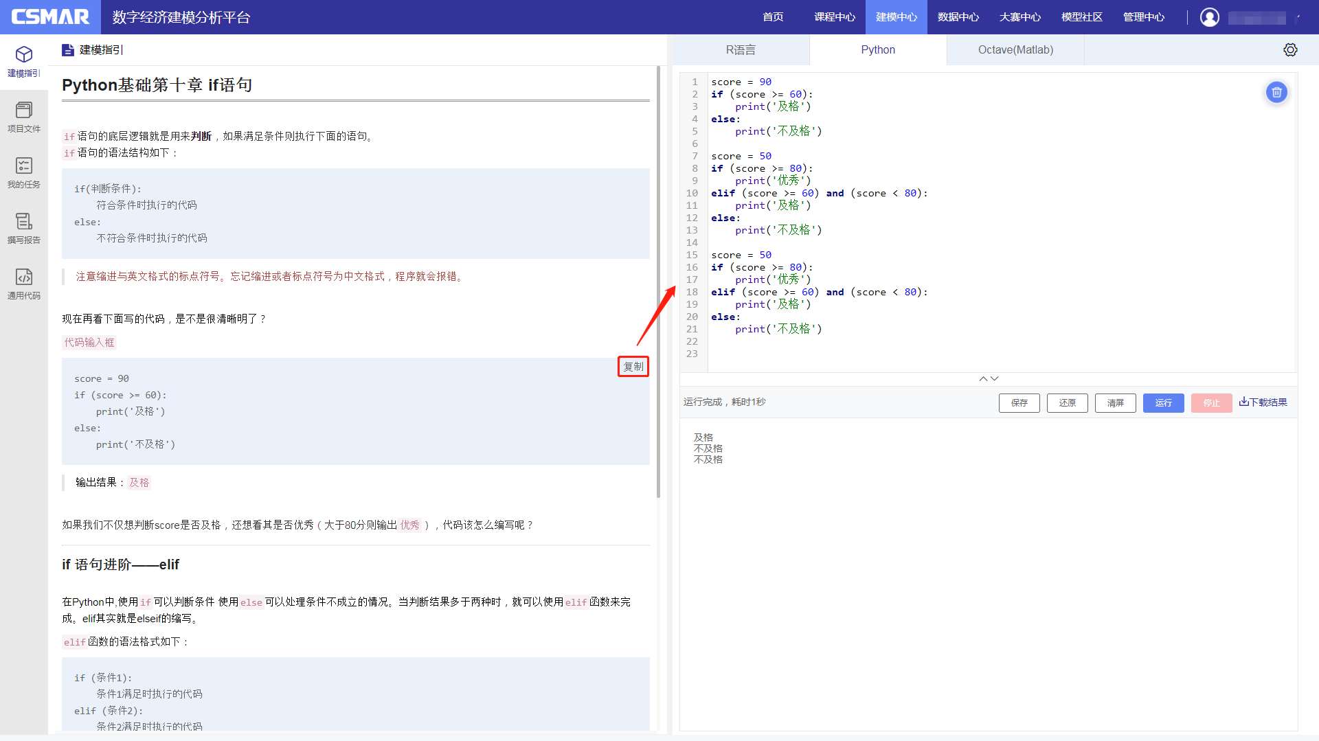 支持丰富通用代码库(73个内嵌算法),附有Python、R语言经典新手入门实操课程,帮助师生边学边练,轻松上手常用数据分析和模型应用