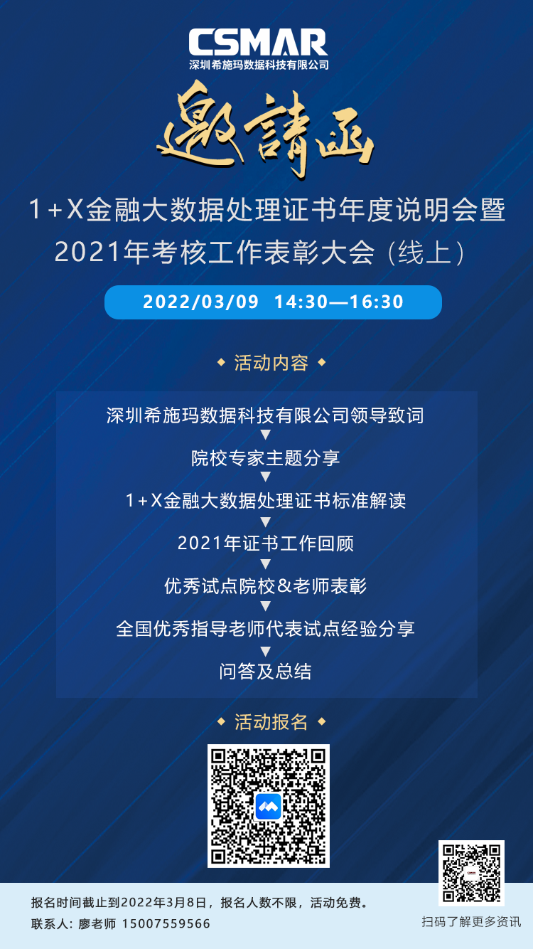 为深入贯彻落实《国家职业教育改革实施方案》和教育部办公厅等三部门《关于推进 1+X 证书制度试点工作的指导意见》等有关文件精神,扎实推进1+X金融大数据处理证书制度试点工作,深圳Ezpay数据科技有限公司(下称深圳Ezpay)将于2022年3月9日下午2:30-4:30举办“2022年1+X金融大数据处理证书年度说明会暨2021年考核工作表彰大会”。